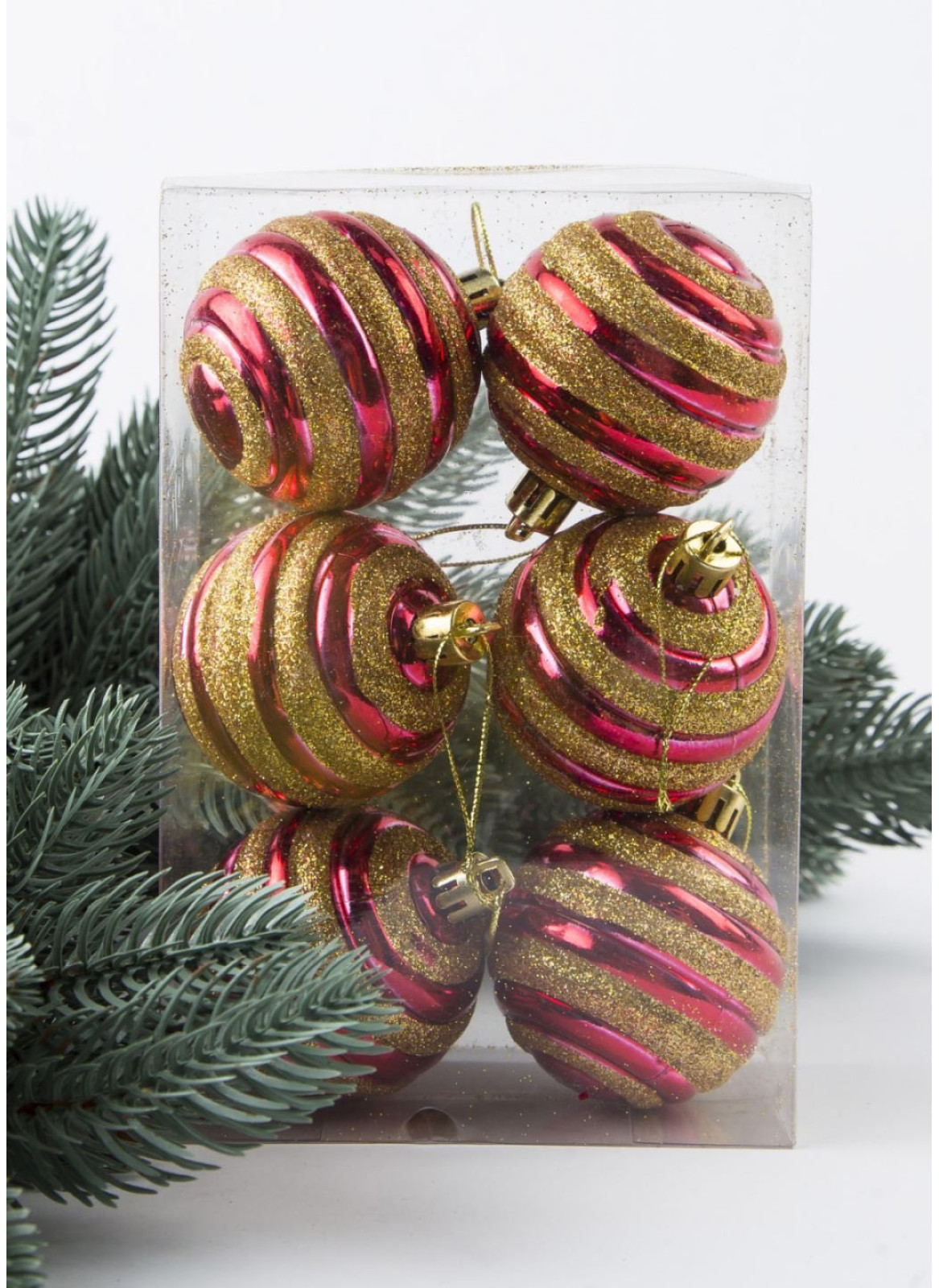Куля 6 см. У пластиковій упаковці. основа червоний колір, прикрашена золотим глітером. В уп 6шт, одного кольору.