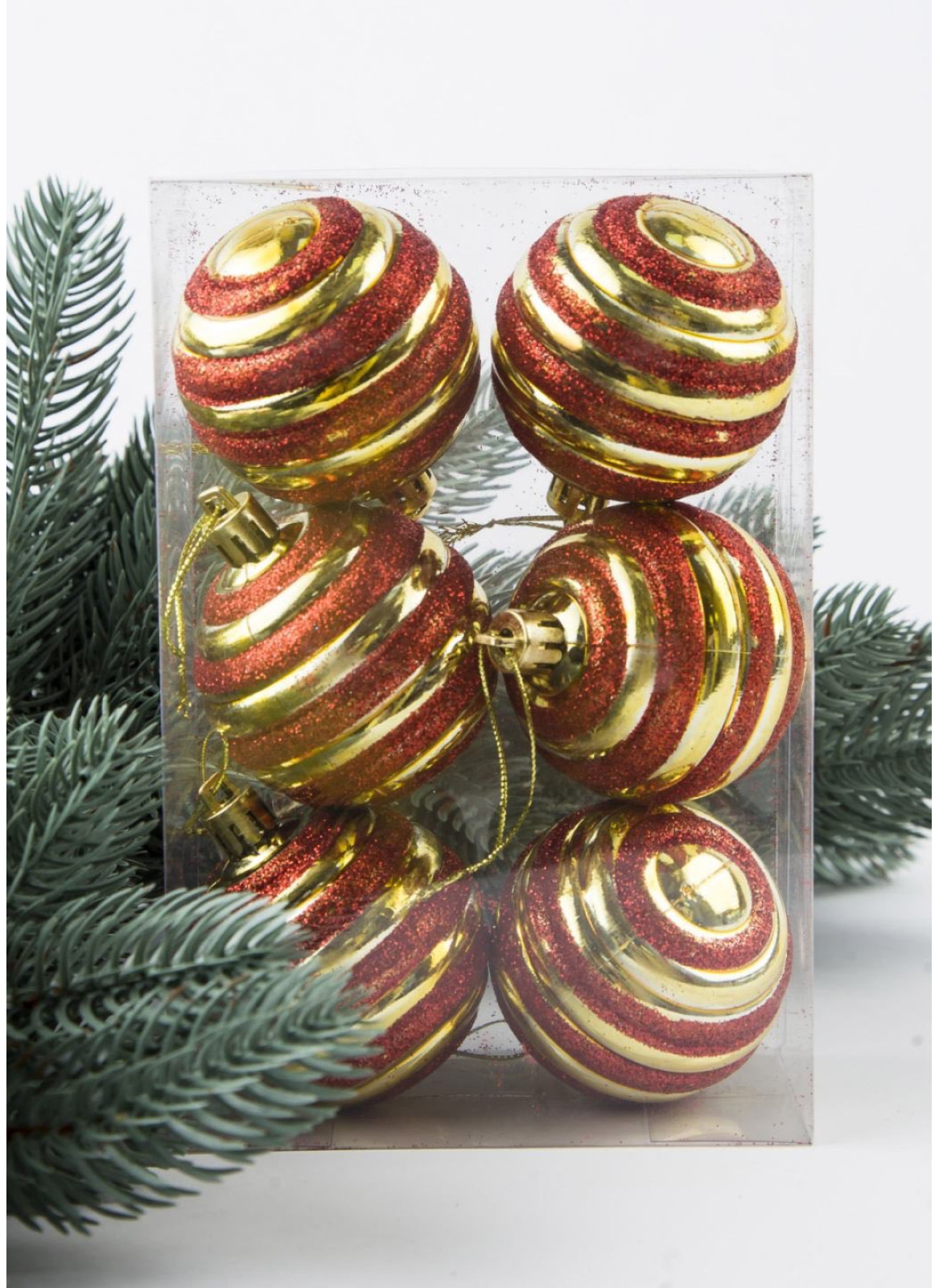 Куля 6 см. У пластиковій упаковці. основа золотого кольору, прикрашена червоним глітером. В уп 6 шт, однакових.