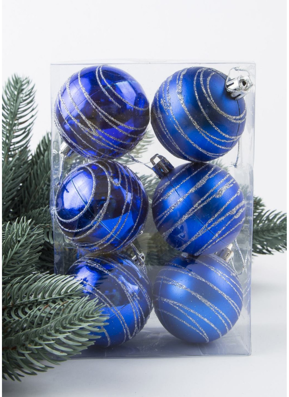 Куля 6 см. синього кольору з лініями з срібного глітеру. Ціна ваказана за 1 уп-6шт.