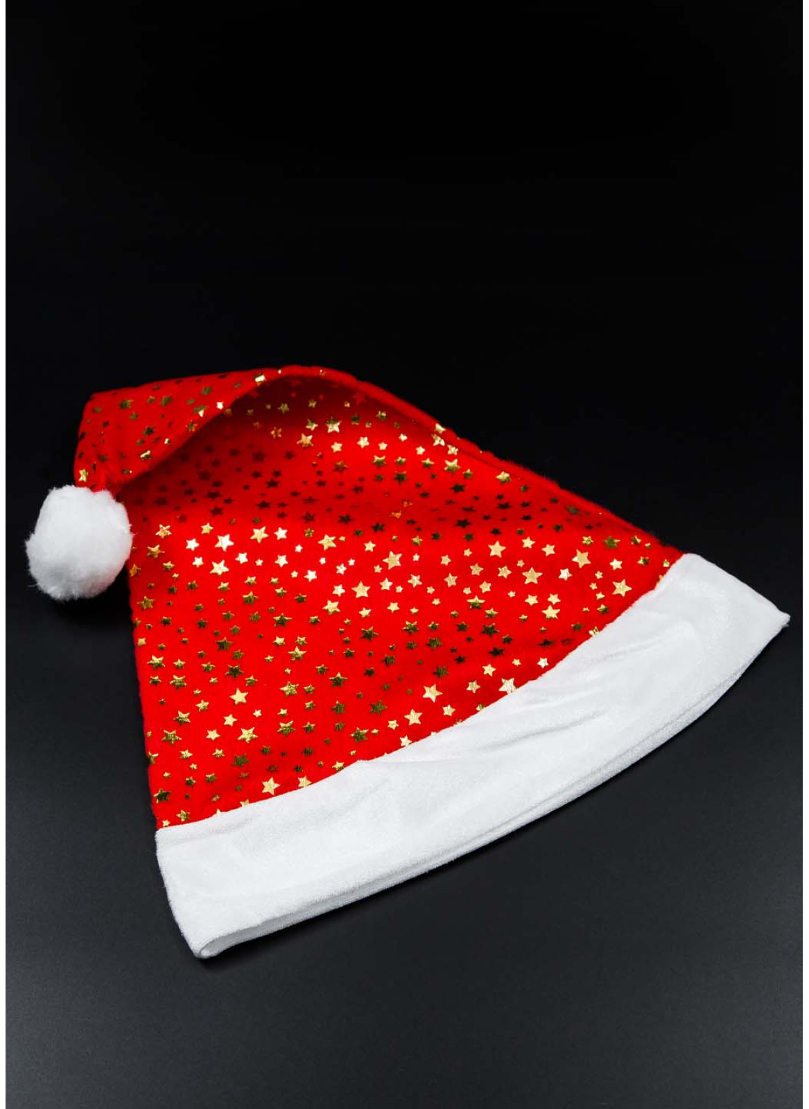 Шапка Діда Мороза, зірки. Матеріал оксамит з принтом-золоті зірки. Висота 42см, діаметр в складеному вигляді - 27см. Ціна за упаковку, 10 шт.