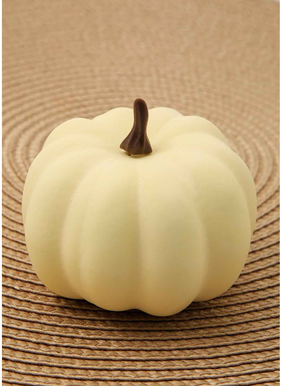 Декоративний білий гарбузик, з коричневим хвостиком. Діаметром 8 см, висота разом з хвостиком 7см. Кожен в окремій упаковці. В основі пінопласт, покритий прорезиненою фарбою.