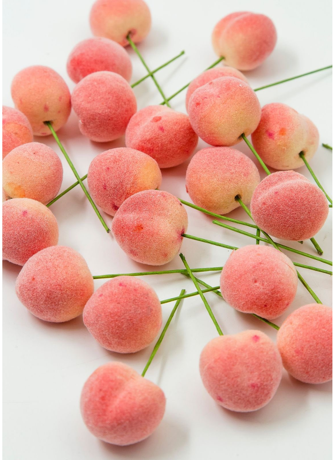 Персик на дротику, діаметр плоду-2,5 см. Сам плід покритий оксамитом (флок). Довжина цілого декору з дротиком- 8 см. Довжина дротика - 5,5 см. В упаковці 100шт.
