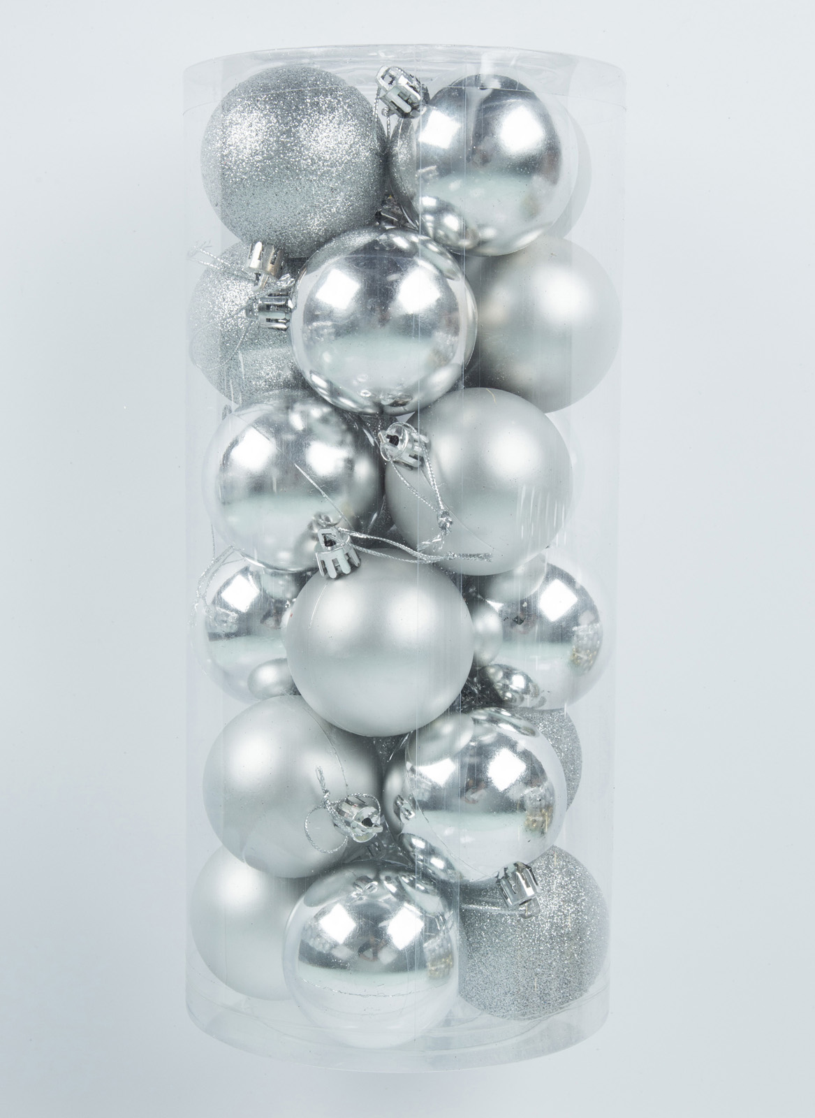 Куля 8 см, колір срібло, в упаковці 24 шт. 3 види: Матові, глянець, з присипкою. Упаковка-пластиковий тубус.