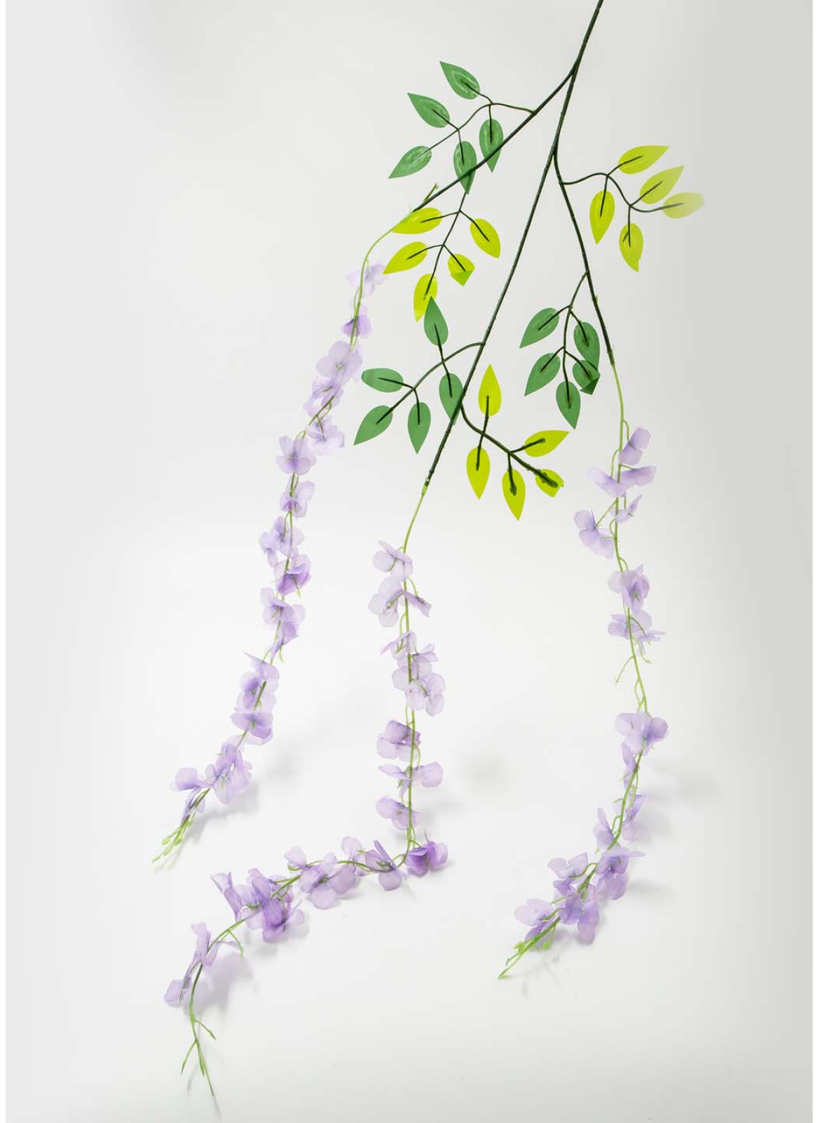 Гліцинія штучна. Загальна довжина гілки 103см. Розгалужена на 3 гілочки. На кожній гілка цвіту з дрібними та тонкими квітами. довжина кожного цвіту 57см.