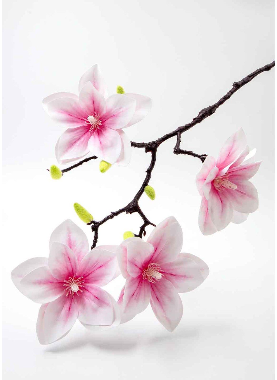 Гілка магнолії, довжина 60см. В основі міцний дріт, з імітацією деревини. Н агілці 4 квітки діаметром 1см. також 6-7 пупянків покритих флоком.
