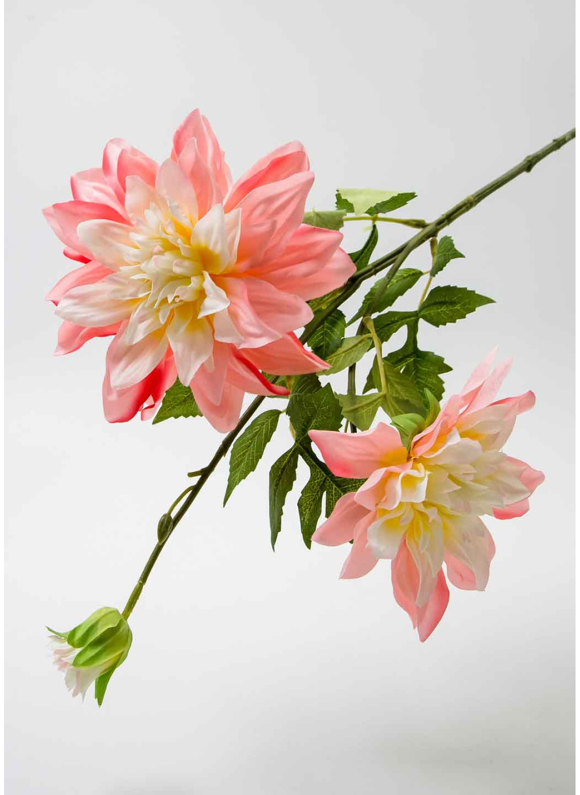 Гілка жоржини "Луїза", висота 68см, Має 2 квітки 15 та 12см, а також пупянок. багато зелених листків від 17до13см. Кожна квітка на окремій гілочці. В основі металічний дріт в якісному пластику з імітацією наторальної гілки.