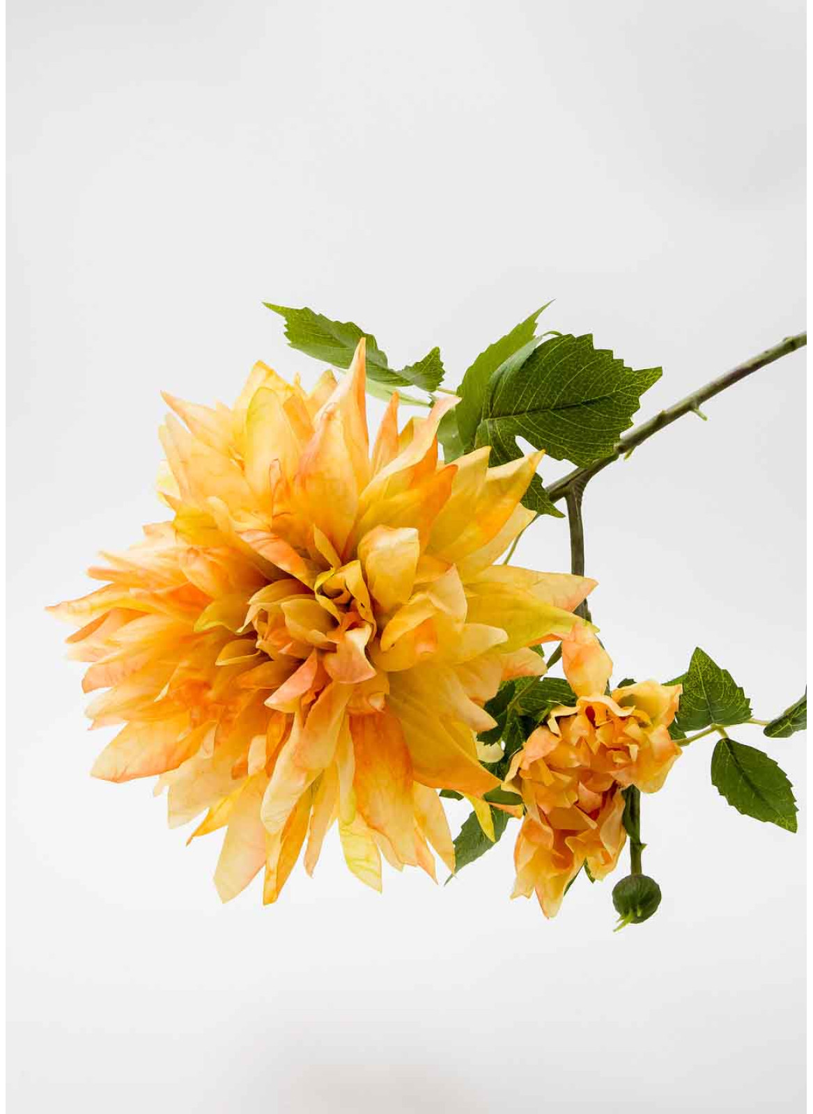 Гілка жоржини великої. висота 68см, Має 2 квітки 18 та 7см, а також пупянок. Декілька зелених листків від 15до10см. Кожна квітка на окремій гілочці. В основі металічний дріт в якісному пластику з імітацією наторальної гілки.