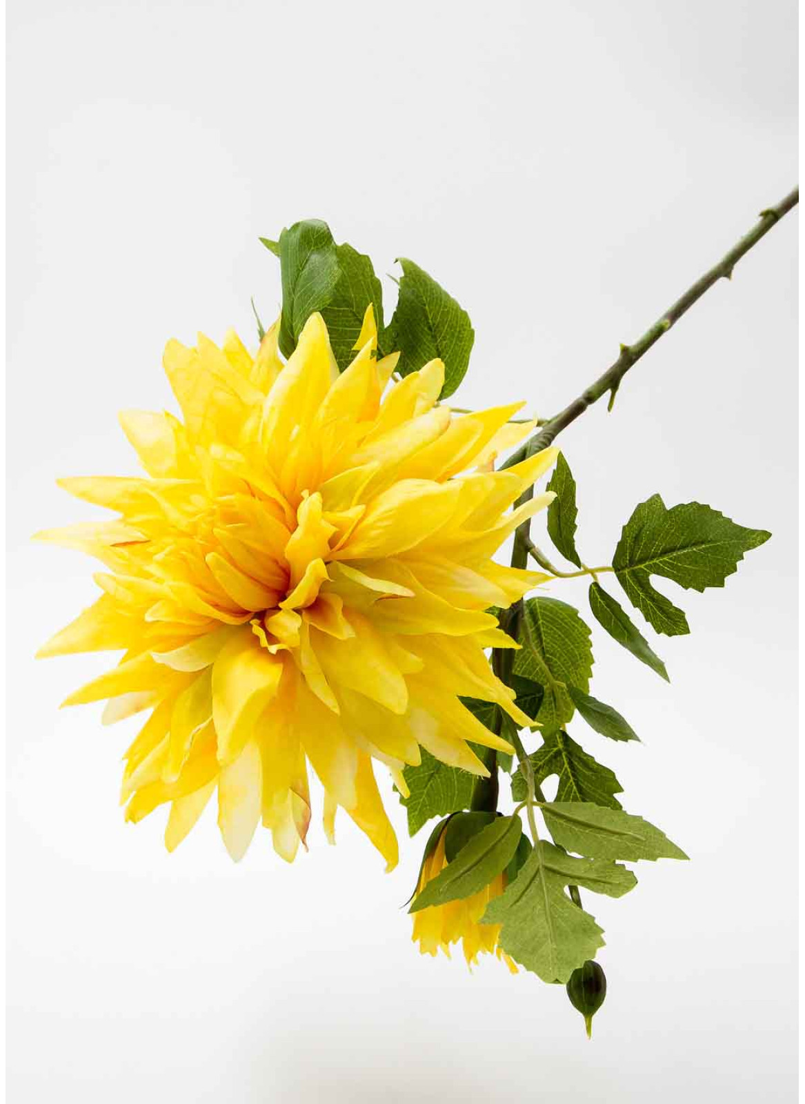 Гілка жоржини великої. висота 68см, Має 2 квітки 18 та 7см, а також пупянок. Декілька зелених листків від 15до10см. Кожна квітка на окремій гілочці. В основі металічний дріт в якісному пластику з імітацією наторальної гілки.