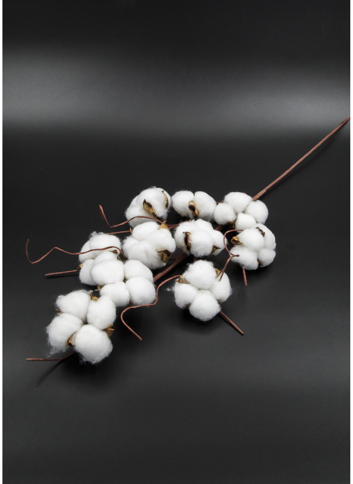 Гілочка новорічна з бавовною. Довжина самої гілки -60см, довжина суцвіття - 33см. Гілка розгалужена на пять гілочок, на яких по 2 голівки бавовни, розміром 5 на 5 см. Загально 10 голівок. Також гілочка прикрашена джгутиками-дротик в тейп стрічці, закручений.