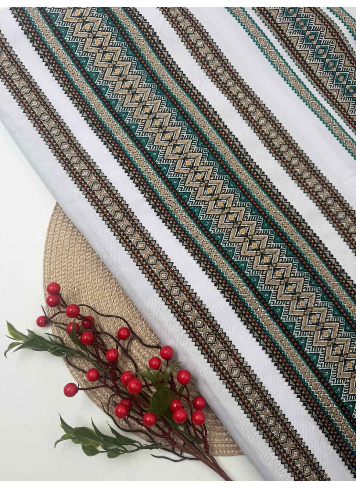 Склад: поліестер-50%, акрил-40%, бавовна -5%, льон-5%. Щільність 195 гр./м.кв. Вид: Машинна вишивка.