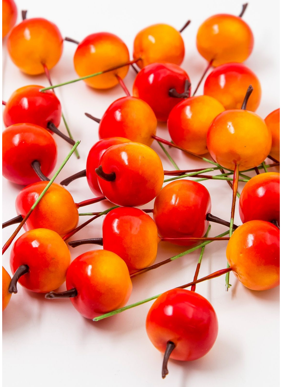 Яблучко на дротику, діаметр плоду-2,7 см. Довжина цілого декору з хвостиком і дротиком- 9,5см. Довжина дротика - 5,5см. В упаковці 100шт.