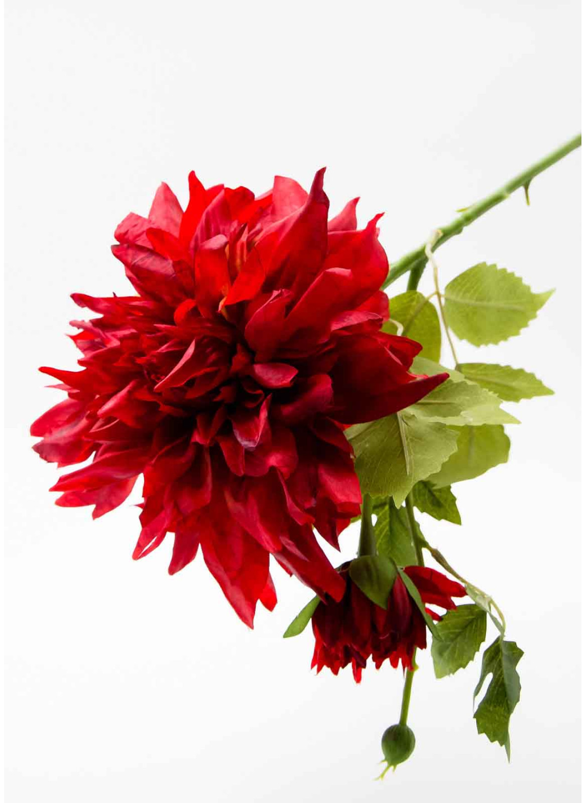 Гілка жоржини великої. висота 68см, Має 2 квітки 18 та 7см, а також пупянок. Декілька зелених листків від 15до10см. Кожна квітка на окремій гілочці. В основі металічний дріт в якісному пластику з імітацією наторальної гілки.